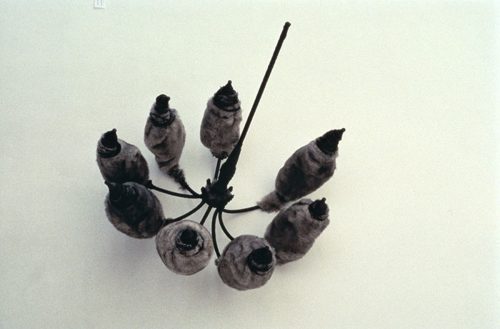 Constructed of breast-like shapes of fake fur wrapped in graphite string, Candelabra rejects expectations of maternity and nurture.
